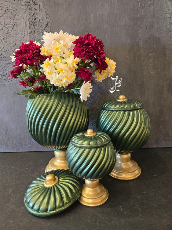 ست بانکه دکوری سهتایی مدل کلاسیک رنگ سبز طلایی | مناسب دکور و گلدان گل